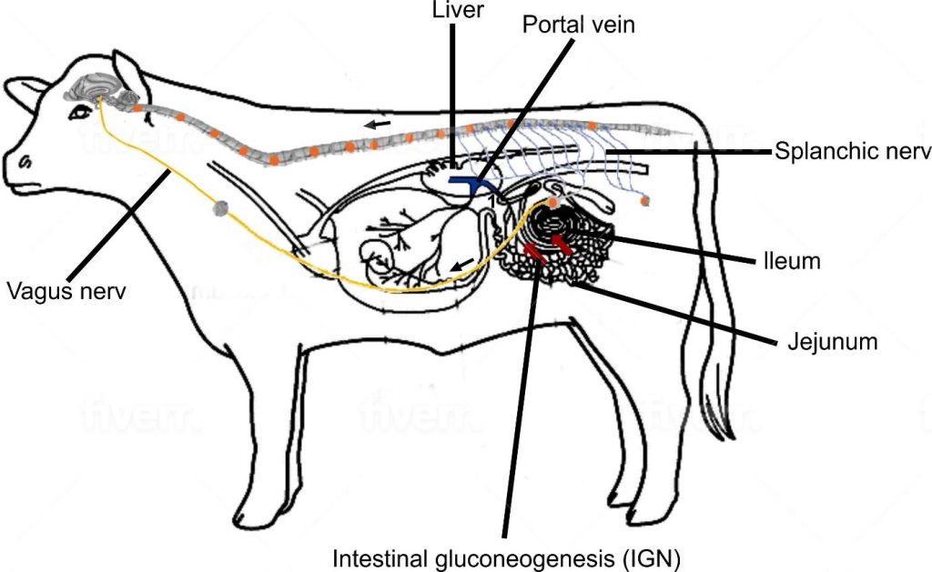 Eine verringerte Gluconeogenese in der Leber aufgrund der Triglyceridansammlung und erhöhten NEFA-Konzentrationen führt zu einem chronischen Entzündungszustand. Die Futteraufnahme wird hauptsächlich durch die Oxidation von NEFA in der Leber kontrolliert, die Sättigungssignale erzeugt. Propionat hat hier einen geringeren Effekt. Fructose kann direkter in Glukose umgewandelt werden als Propionat, ohne die Leberoxidation zu stimulieren.